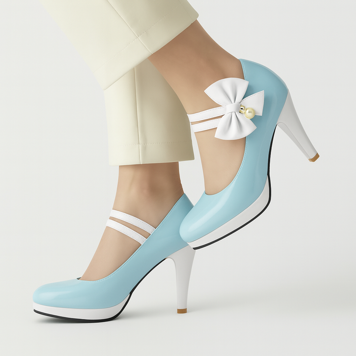 Glossy leather and a delicate bow adorned with pearl accents add a refined touch to these beautiful heels, while the dual straps ensure a secure and graceful fit.