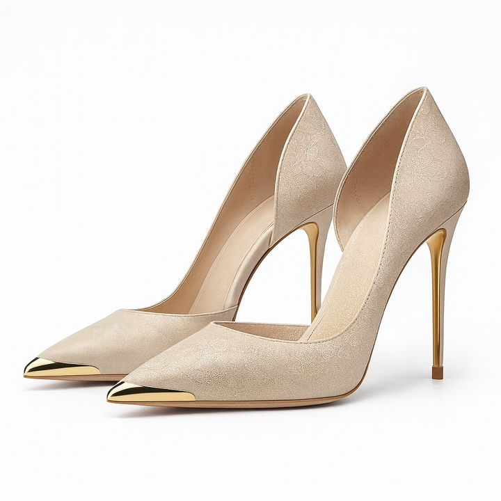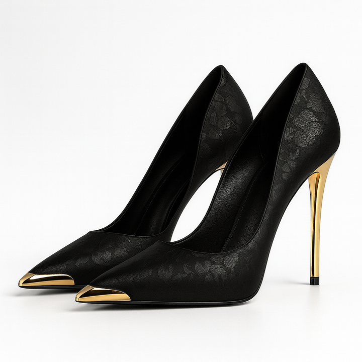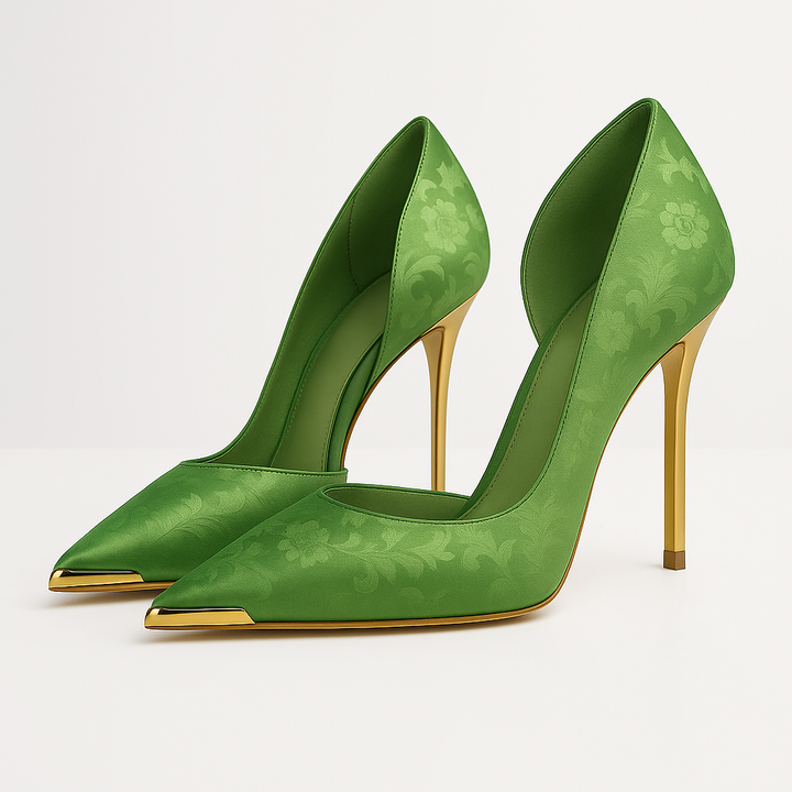 Crafted in satin jacquard with gleaming gold accents, these stiletto heels fuse bold glamour with graceful poise. A cushioned footbed, structured arch, and sculpted gold heel deliver confident comfort—made for nights that demand a standout entrance.