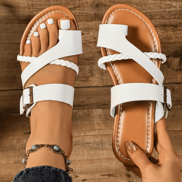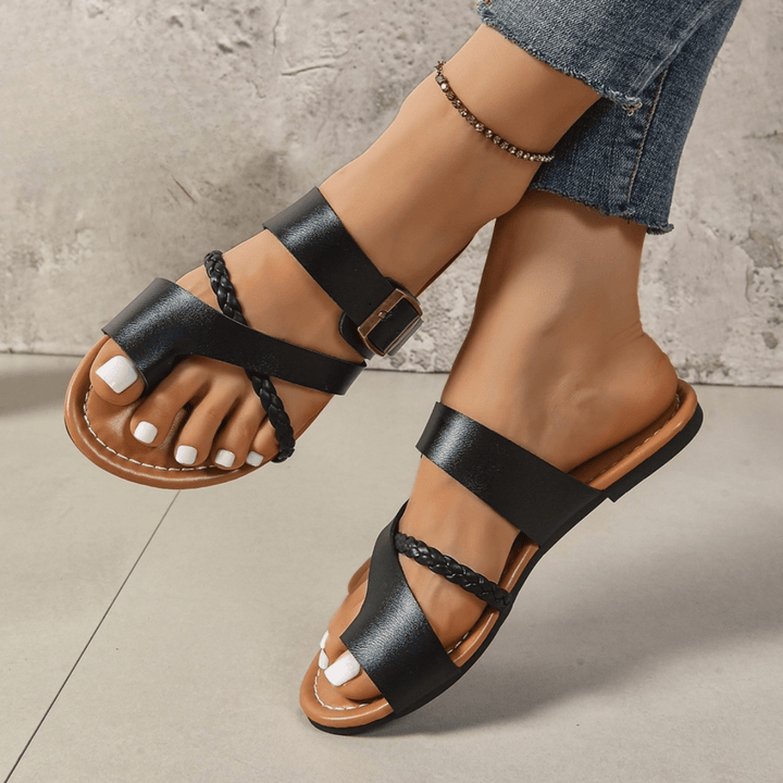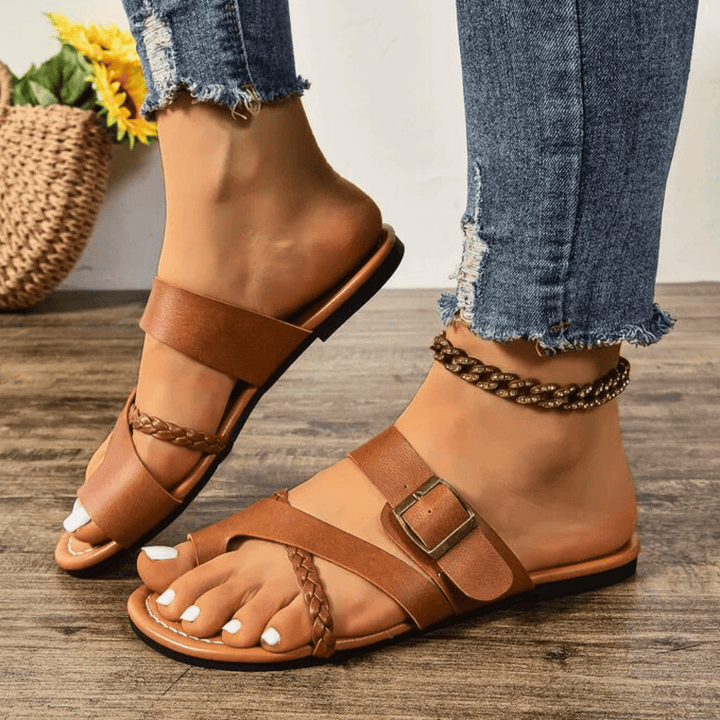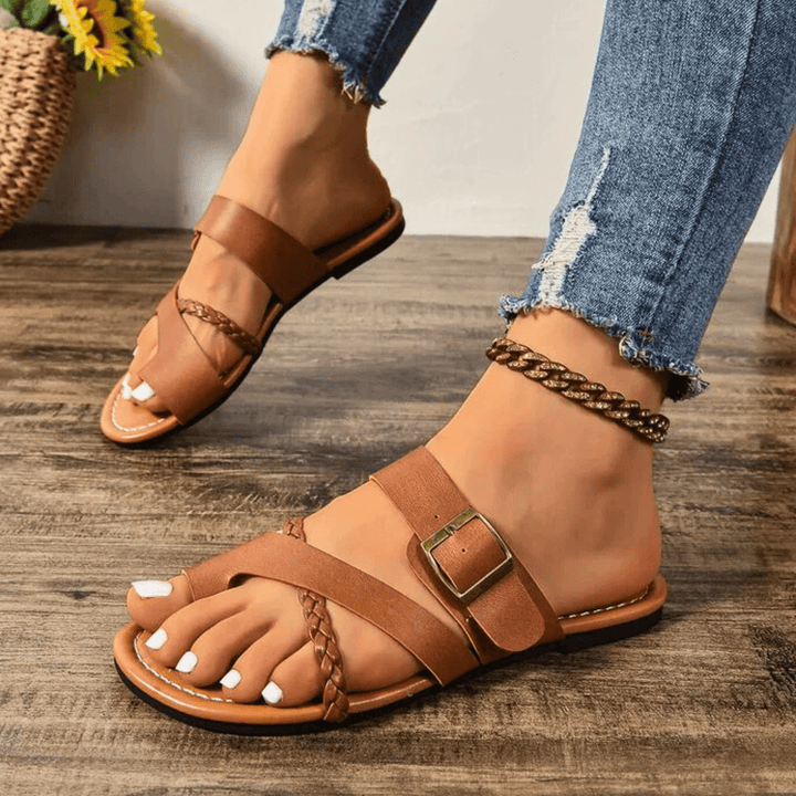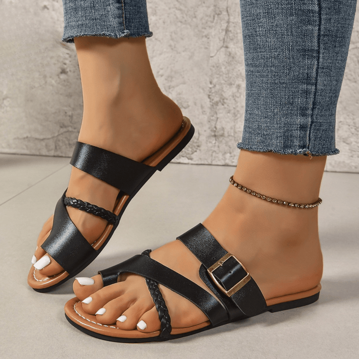 Crafted with chic leather straps and a secure clip-toe design to prevent slipping. The cushioned insole and non-slip outsole offer superior support, while the sleek buckle closure adds a touch of elegance to your every step.