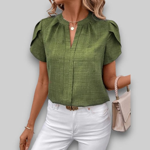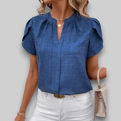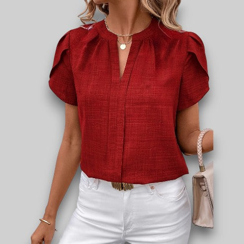 Softly structured and effortlessly polished, the Maris Petal Sleeve Blouse brings a touch of charm to everyday looks. Its fluttery sleeves and subtle neckline pleats create easy sophistication.