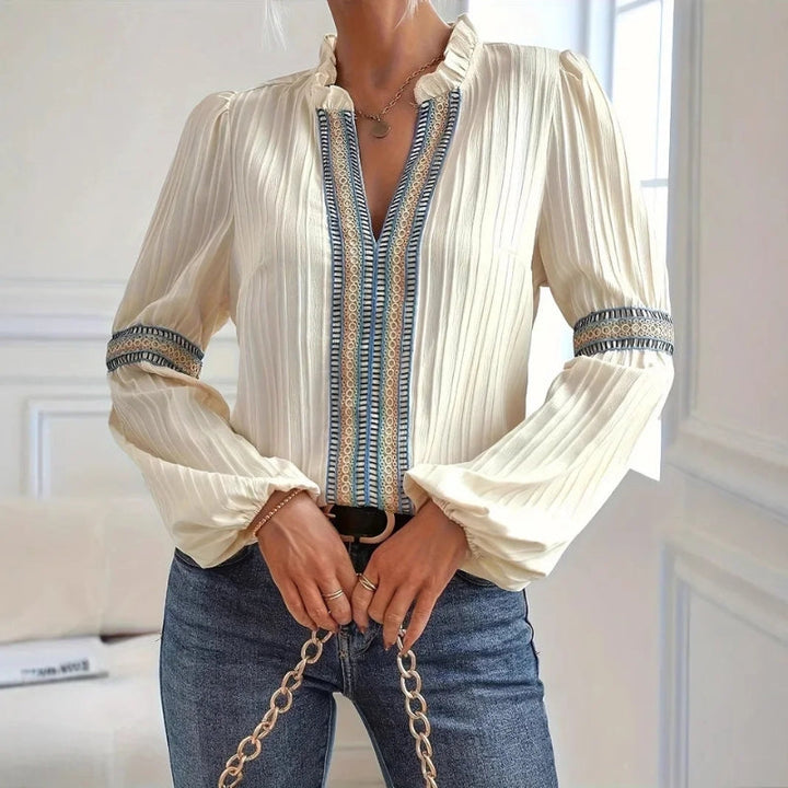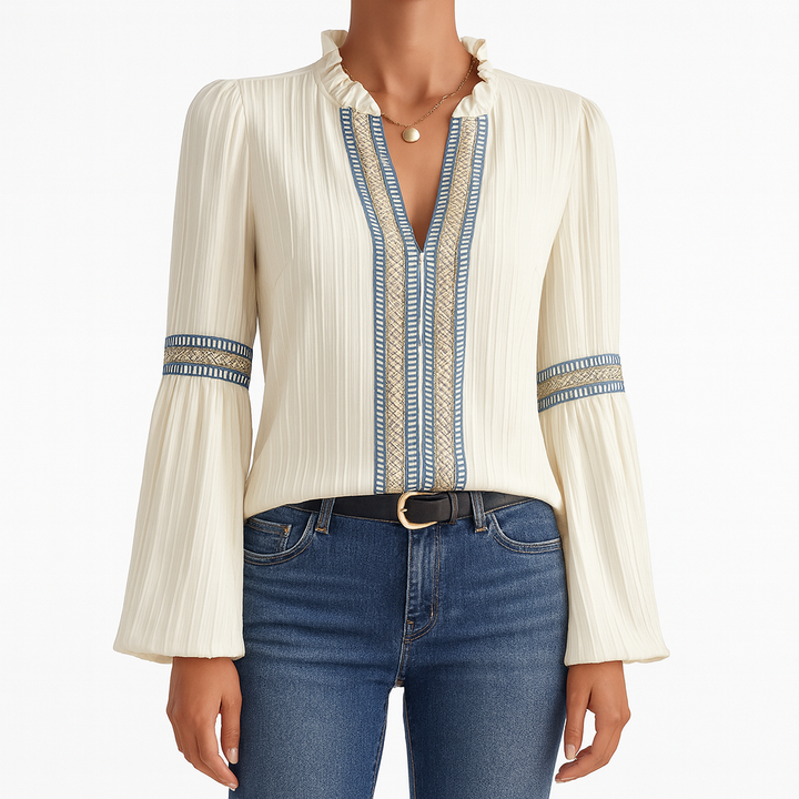 Crafted from a breathable blend with pleated lines and hand-finished lacework, this shirt adds dimension without distraction. The fluted sleeves and high collar offer presence, not fuss.