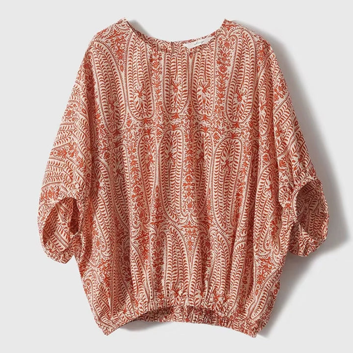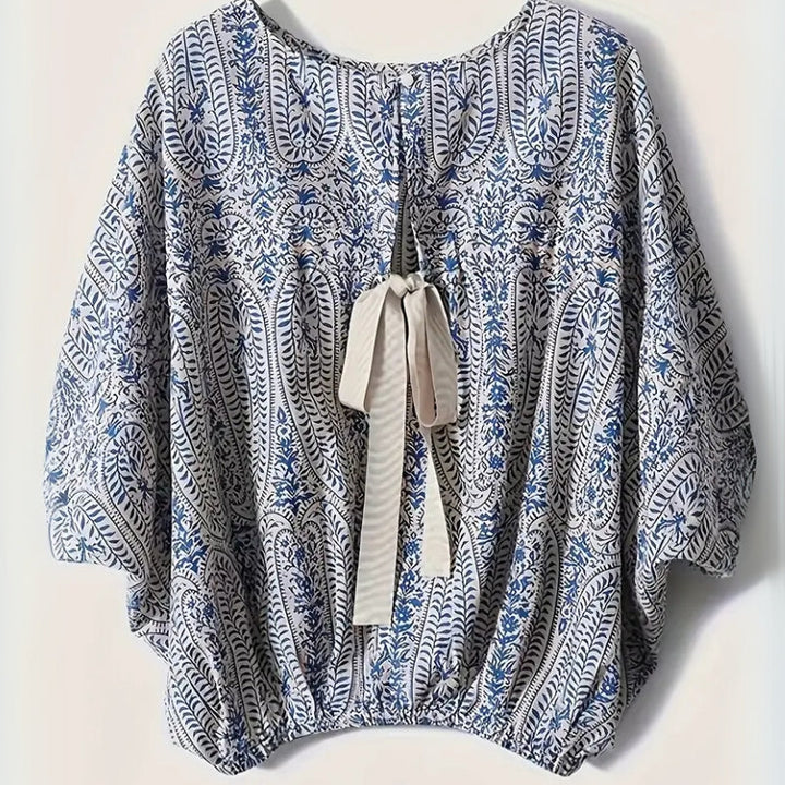 Soft to the touch and built for movement, this vintage-patterned blouse balances freedom with form. A back ribbon accent cinches the waist gently, making it an easy favorite for everyday layering.
