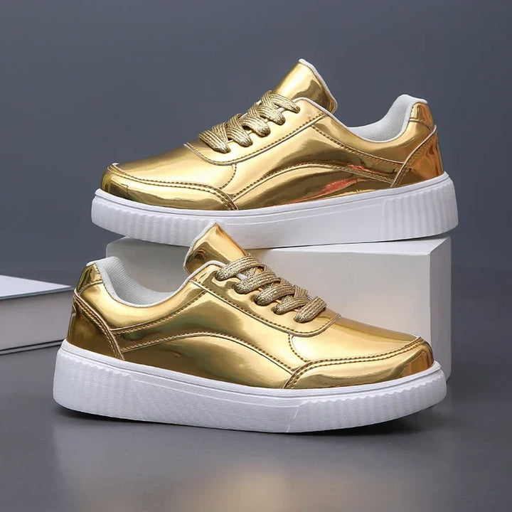 A metallic finish brings a bold, futuristic shine to these sleek sneakers, designed with a cushioned sole for all-day comfort and a standout silhouette that pairs effortlessly with any look.