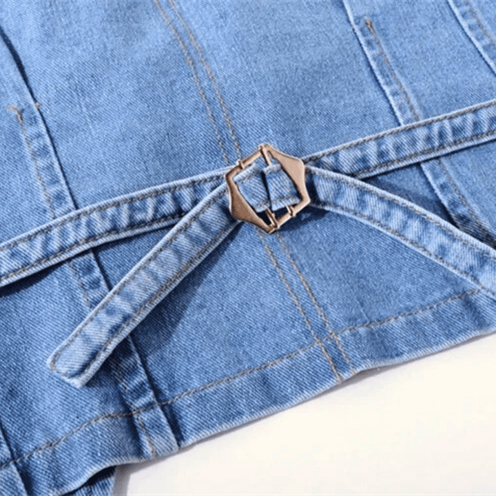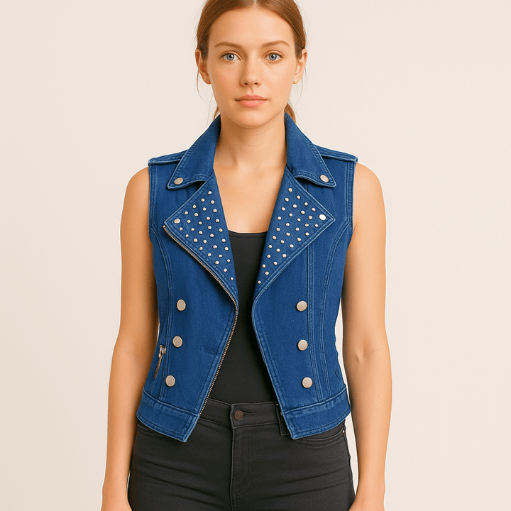 A bold, sleeveless statement piece made from premium cotton denim and finished with eye-catching silver studs. With its flattering slim fit and edgy vibe, it’s the perfect layering piece to elevate your spring and summer looks.