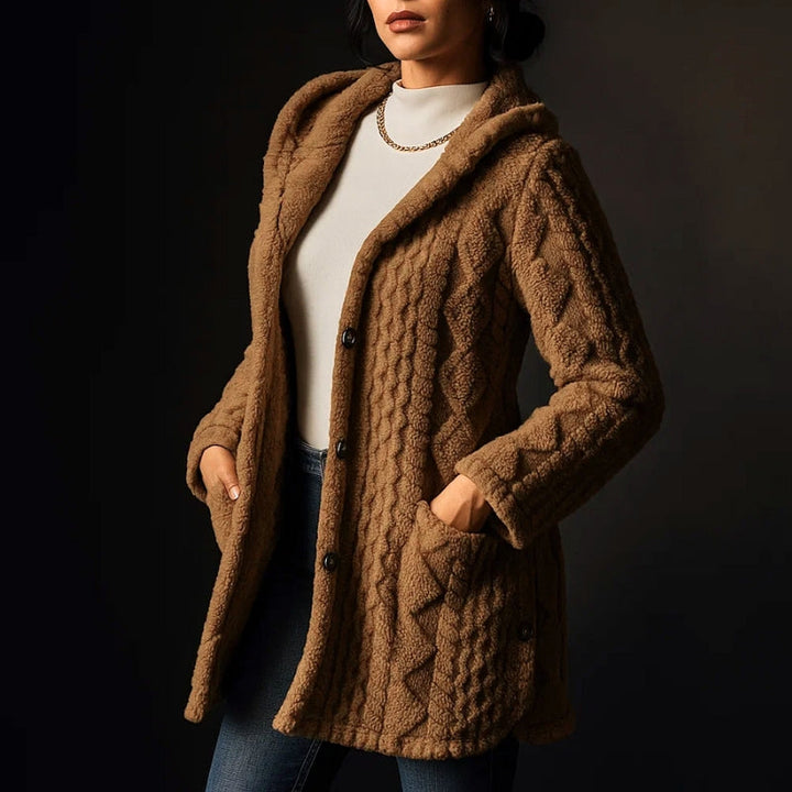 Bundle up for the season in a jacquard plush coat that layers comfort with clean lines. Finished with a hood and buttons for everyday wear.